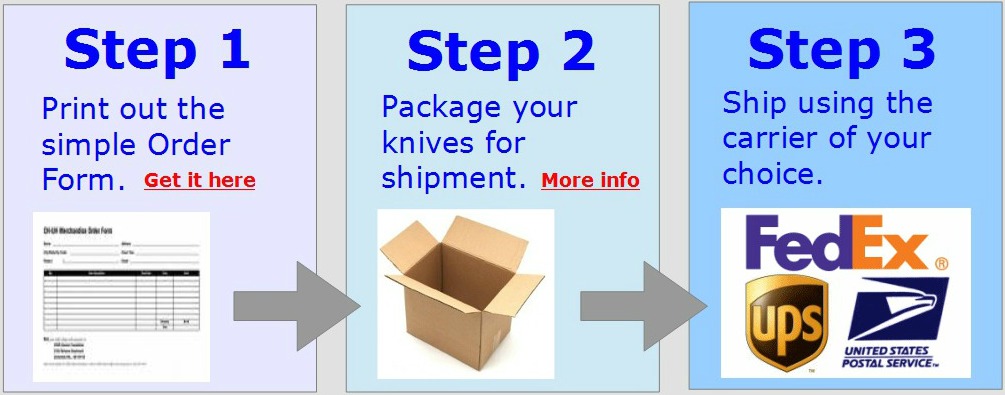 * Your knives will be sharpened and mailed back to you within 48 hours of receipt of payment with the following exception. If your knives arrive at my shop on a Friday or Saturday, I will sharpen them over the weekend and mail them back out on the following Monday. If you have any questions please contact me.